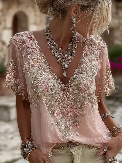 $25.99Vintage Classy Gradient Blue Rose And Floral Embroidered Pattern V Neck Long Sleeve Shirt