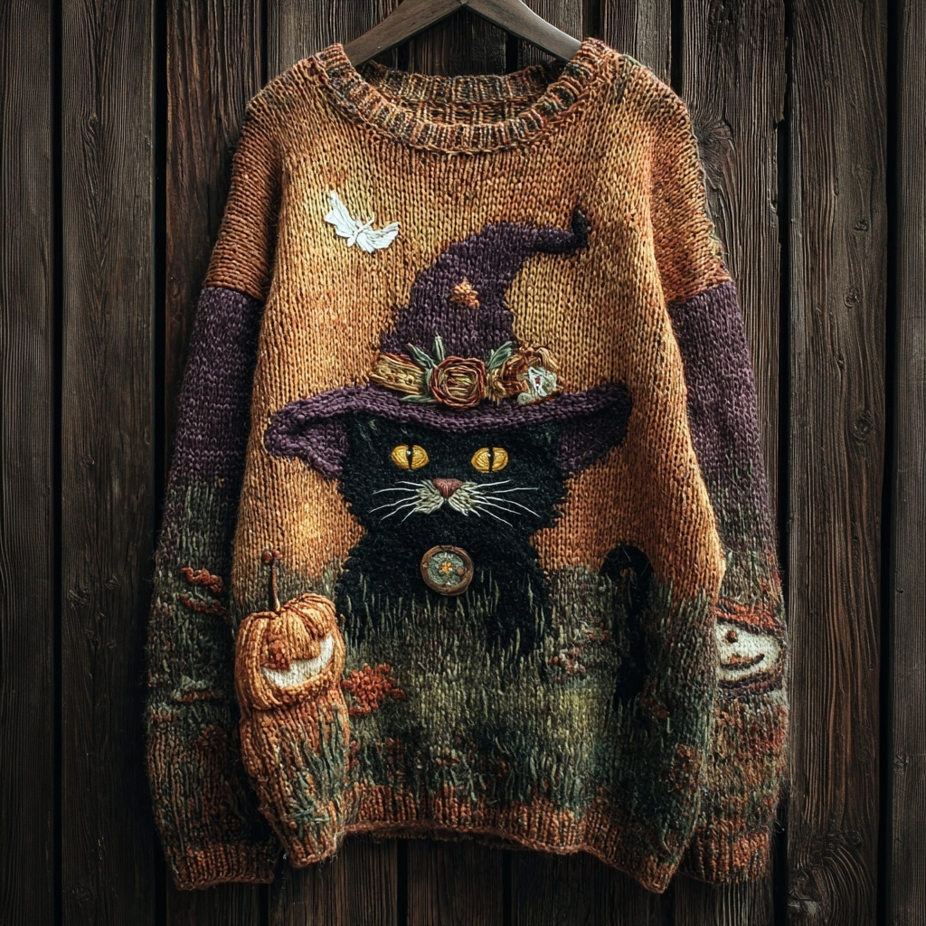 Halloween Witch Black Cat Vintage Cozy Knit Sweater