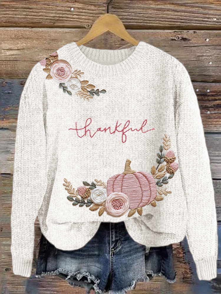 Thanksgiving Thankful Pink Pumpkin Floral Embroidered Cozy Sweater